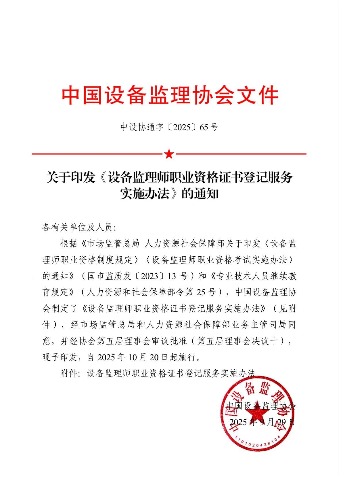 近日,中國設備監理協會發布了“關于印發《設備監理師職業資格證書登記服務實施辦法》的通知”,通知指出本辦法自2025年10月20日起施行。