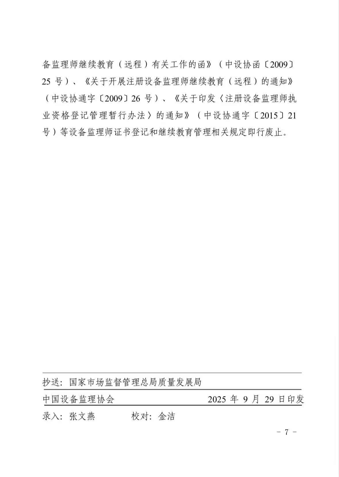 根據《市場監管總局 人力資源社會保障部關于印發〈設備監理師職業資格制度規定〉〈設備監理師職業資格考試實施辦法〉的通知》(國市監質發〔2023〕13號)和《專業技術人員繼續教育規定》(人力資源和社會保障部令第25號),中國設備監理協會制定了《設備監理師職業資格證書登記服務實施辦法》,經市場監管總局和人力資源社會保障部業務主管司局同意,并經協會第五屆理事會審議批準(第五屆理事會決議十),現予印發,自2025年10月20日起施行。